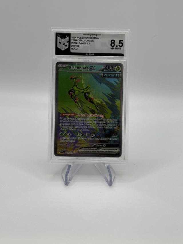 Das moderne Full-Art-Design mit futuristischer Ästhetik und intensiven Grüntönen macht Eisenblatt EX zu einem echten Blickfang. Als Teil des Temporal-Forces-Sets erfreuen sich diese Karten bereits großer Beliebtheit bei Sammlern moderner Pokémon-Serien. Die Karte ist sicher im originalen CGS-Case versiegelt und eignet sich ideal für Display, Sammlung oder als Einstieg in graded Modern-Karten.