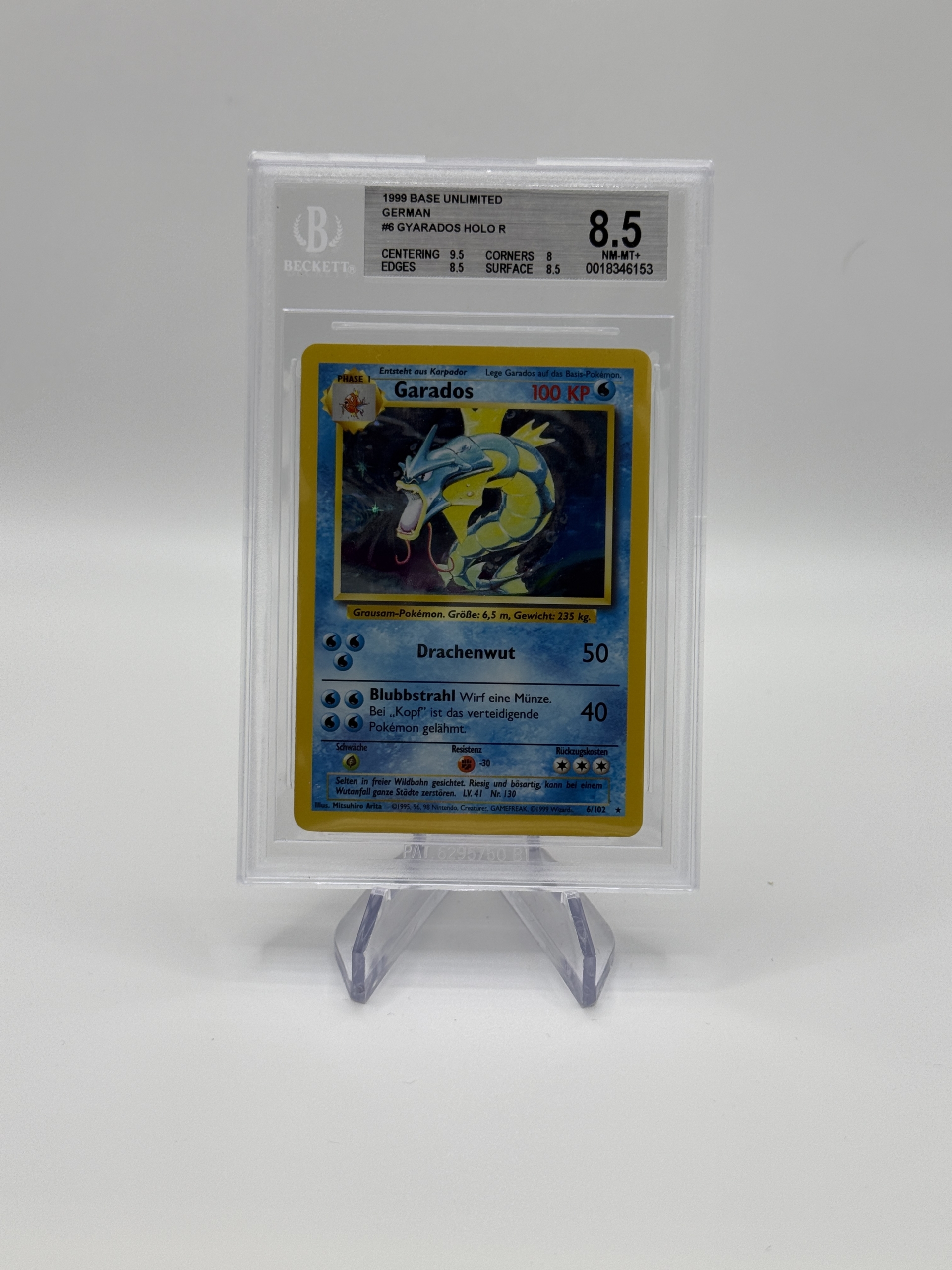 Diese originale Pokémon Garados Holo Karte aus dem Base Set von 1999 zählt zu den bekanntesten und begehrtesten Karten der gesamten Pokémon-Geschichte. Die Karte stammt aus der deutschen Unlimited-Version und wurde von Beckett Grading Services (BGS) mit der starken Gesamtnote 8.5 (NM-MT+) bewertet.