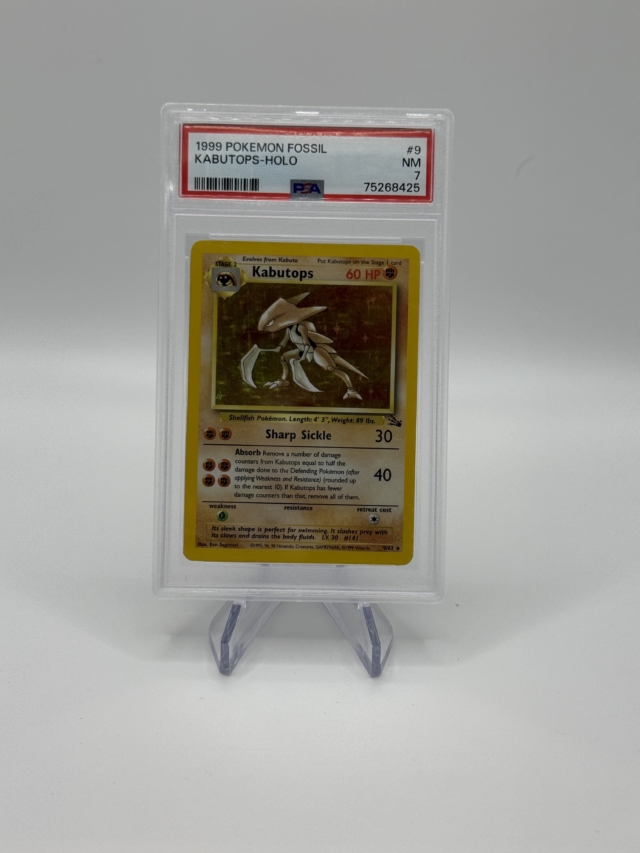 Diese originale Pokémon Kabutops Holo Karte aus dem Fossil-Set von 1999 ist ein klassisches Sammlerstück aus der frühen Pokémon-Ära. Die Karte liegt in der englischen Unlimited-Version vor und wurde von PSA (Professional Sports Authenticator) mit der Note 7 (Near Mint) bewertet.
