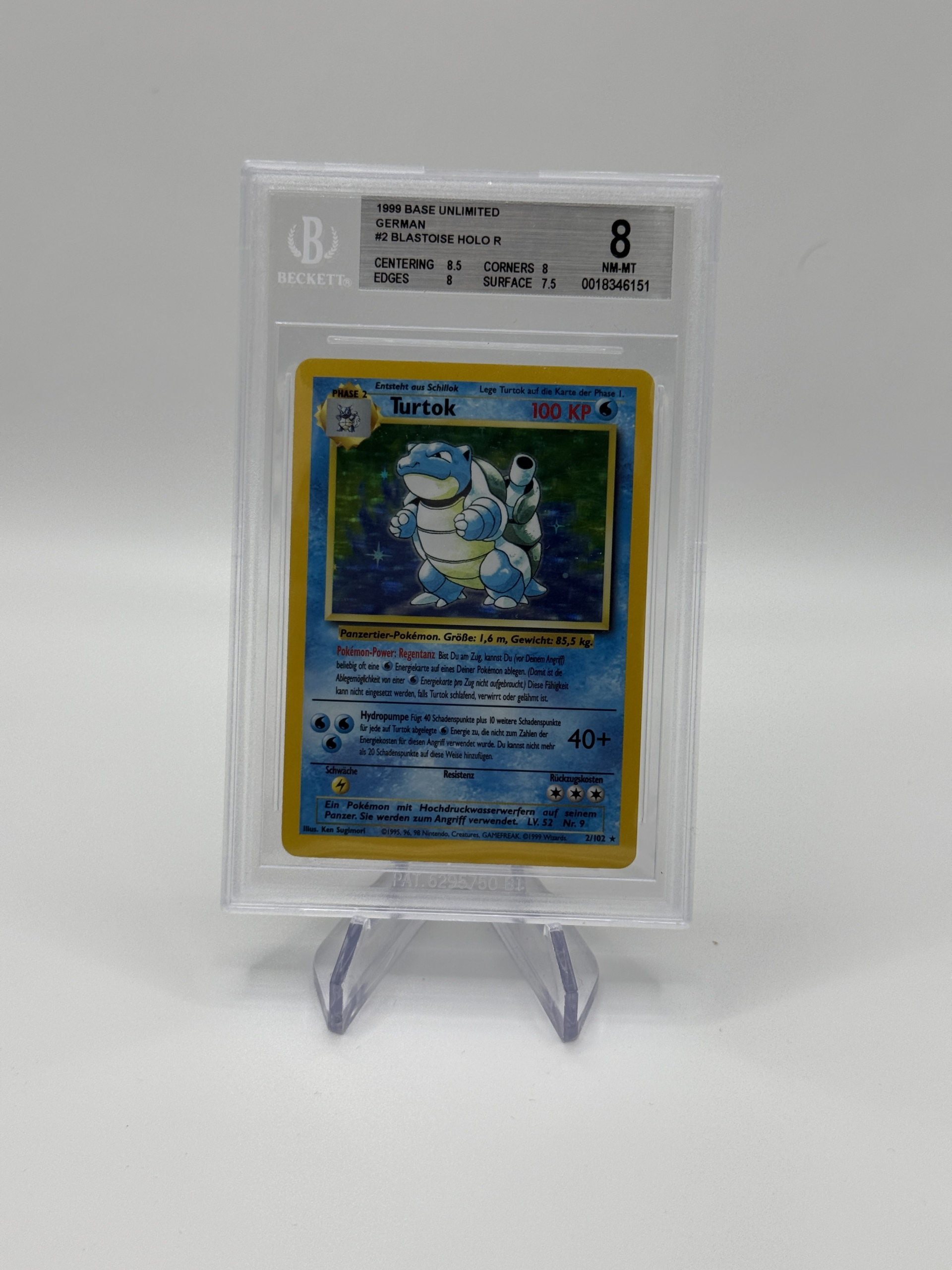 Diese originale Pokémon Turtok Holo Karte aus dem Base Set von 1999 gehört zu den ikonischsten Karten der gesamten Pokémon-Geschichte. Die Karte stammt aus der deutschen Unlimited-Version (kein First Print / keine 1st Edition) und wurde von Beckett Grading Services (BGS) mit der Gesamtnote 8 (NM-MT) bewertet.